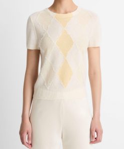 Vince Women’s Hand-cut Argyle Wool-blend Short-sleeve Sweater | Crema & Palazzo & Buttermilk